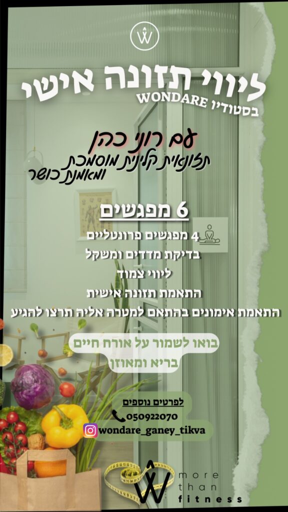במסגרת הליווי תקבל/י- מפגשים פרונטליים, ליווי צמוד בוואצאפ, התייחסות לאימונים – תכנית תזונה מותאמת אישית עבור המטרות שלך. המטרה שלי היא לא רק להביא אותך לתוצאות ה"כאן ועכשיו" אלא לצייד אותך בכלים פרקטיים ובריאים שילוו אותך גם המשך הדרך.״